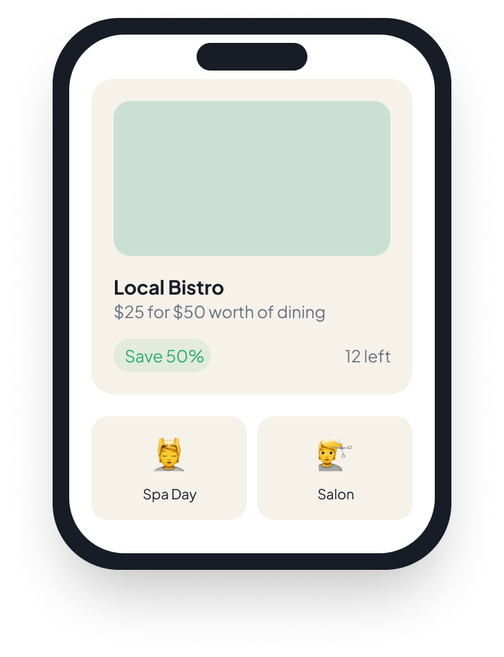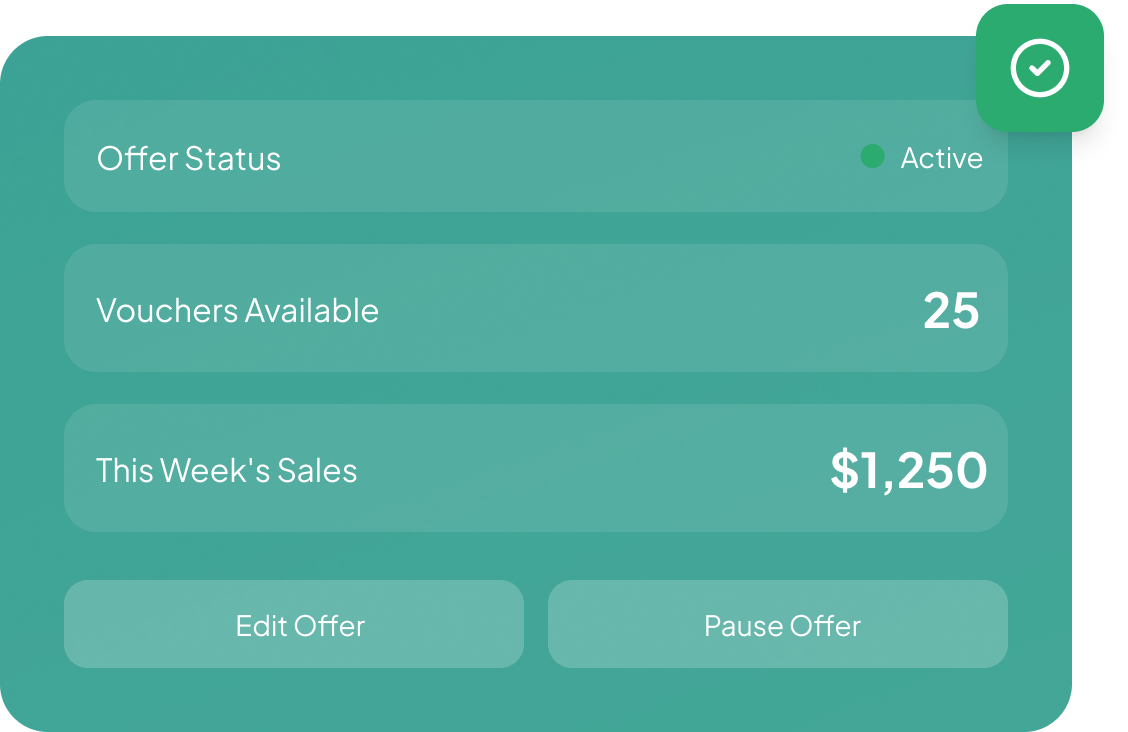 Customers receive a digital voucher after purchase. When they visit your business, they show the voucher on their phone, and you mark it as redeemed through a simple dashboard or app.